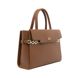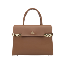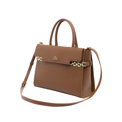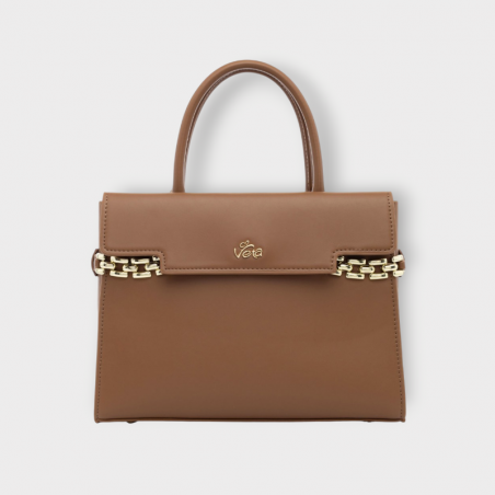 Τσάντα χειρός ανοιχτό καφέ με διακοσμητικά χρυσά μπρασελέ.